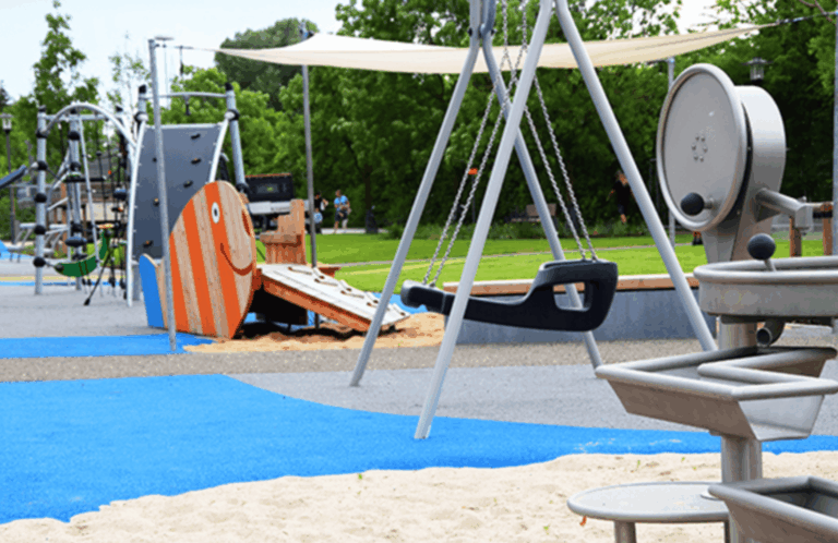 Auch an die Erwachsenen wurde gedacht, denn mit der geografischen Nähe zur KiTa, Schule und Altenheim ist der Bereich einfach zu erreichen und die vielfältigen Sitzmöglichkeiten laden zum Verweilen und Entspannen ein. Der beliebte Seniorenfitness-Parcours wurde in den Spielbereich mit eingebunden. Auch die angrenzende Skaterbahn kann weiter von den Jugendlichen genutzt werden.