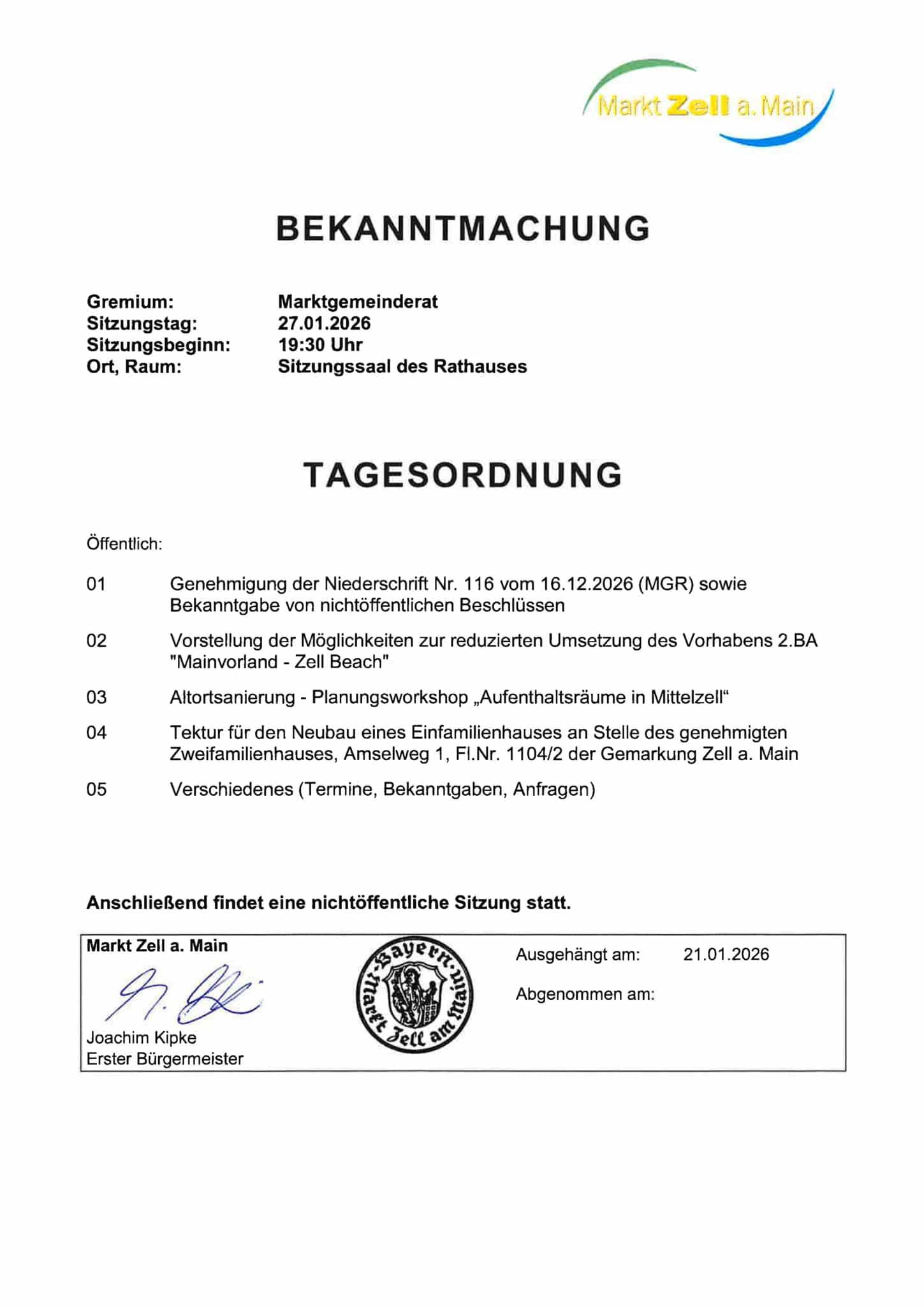 Sitzung Marktgemeinderat am 27.01.2026