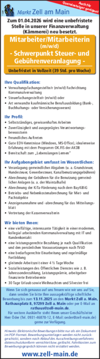 Beim Markt Zell a. Main (Landkreis Würzburg, 4.400 Einwohner), wird zum 01.04.2026 in Vollzeit die unbefristete Stelle eines Mitarbeiters/einer Mitarbeiterin…